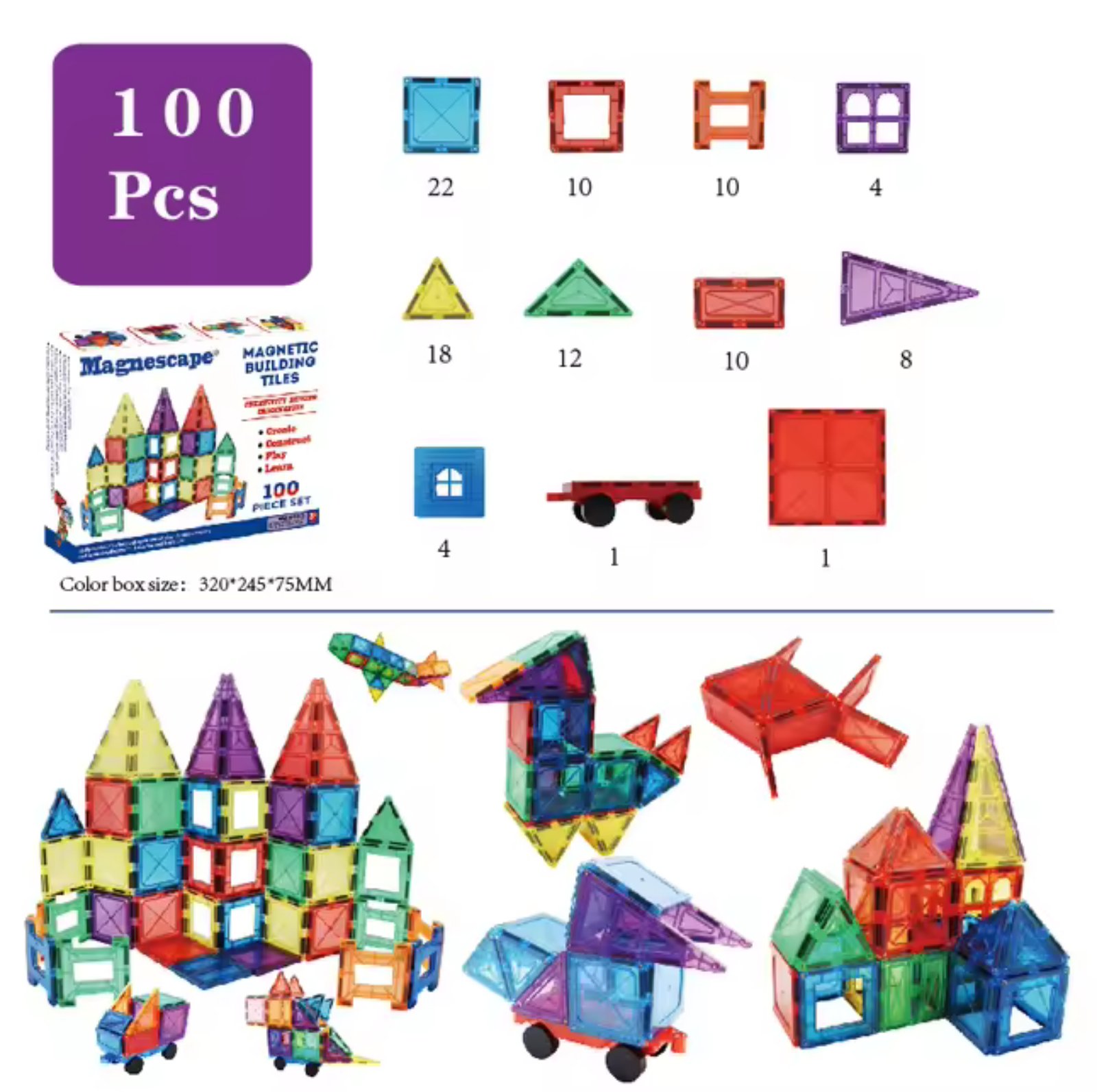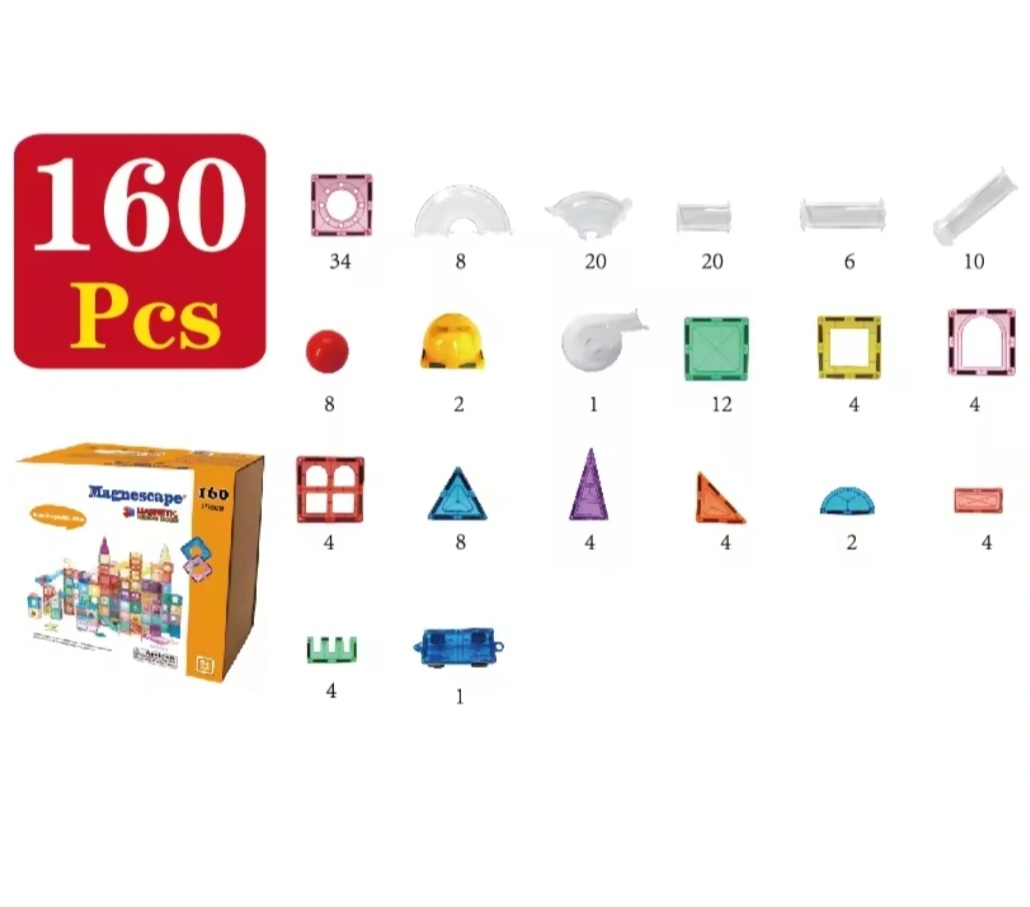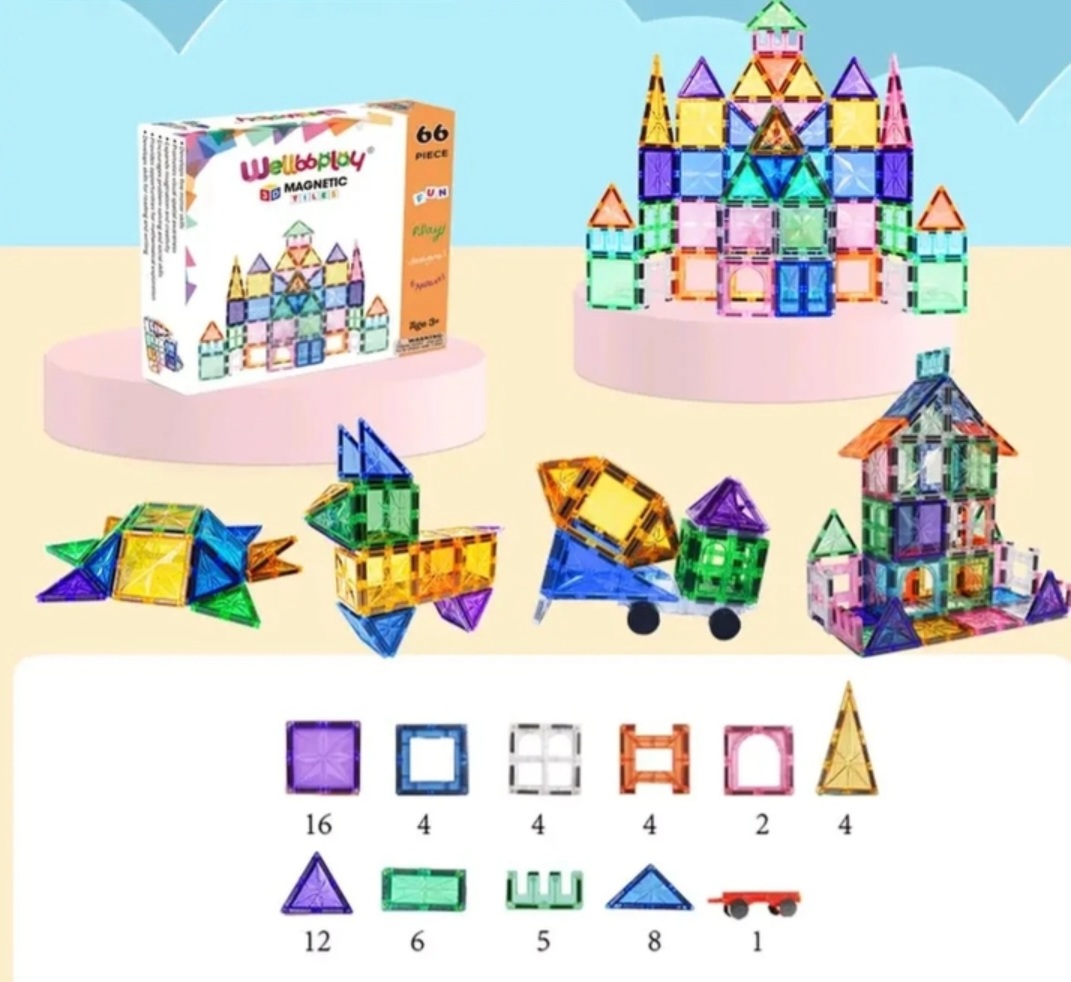 Set sadrži 66 raznobojnih elemenata različitih oblika: kvadrate, trouglove, prozore, vrata, pravougaonike, točkove i platformu za vozila. Zahvaljujući jakim magnetima, delovi se lako spajaju iz svih pravaca, što omogućava stabilne i maštovite konstrukcije.