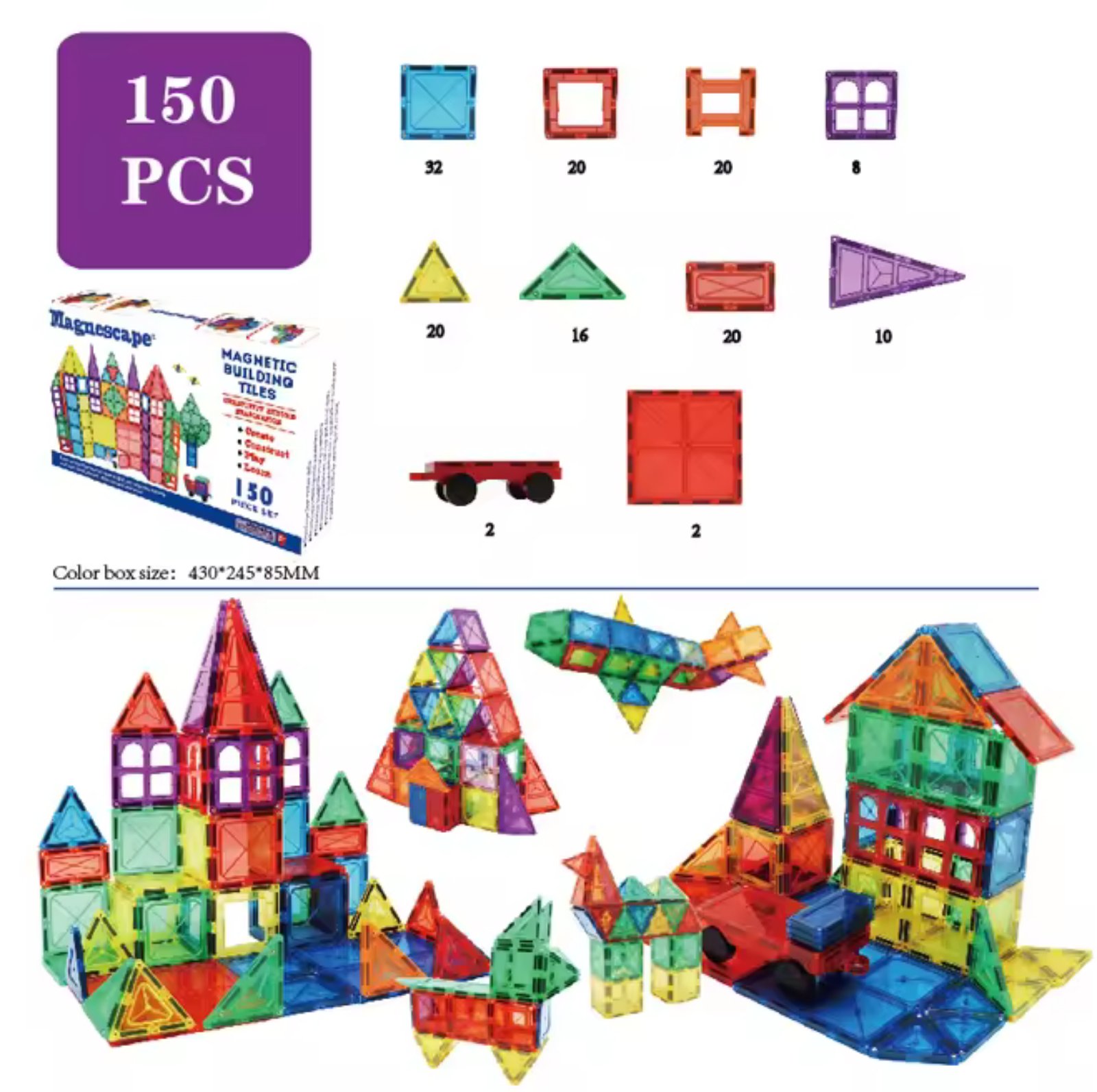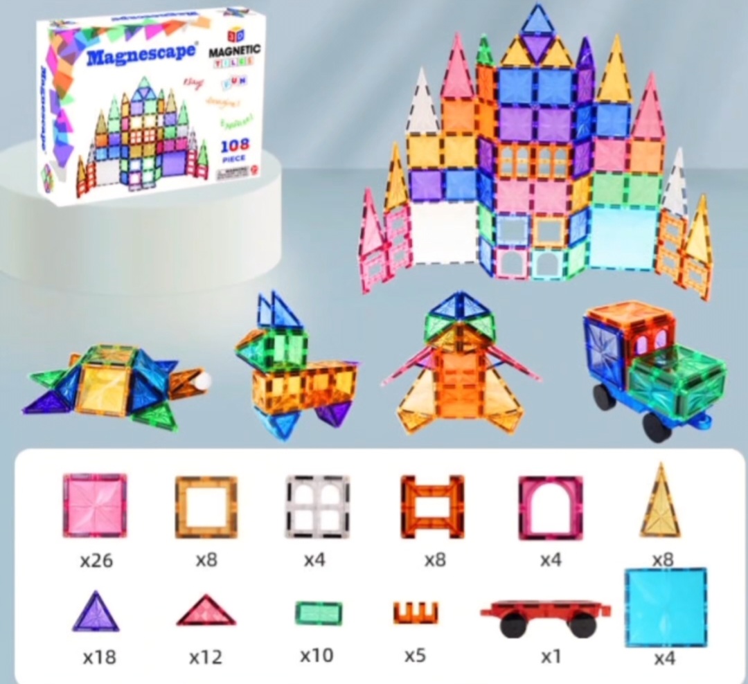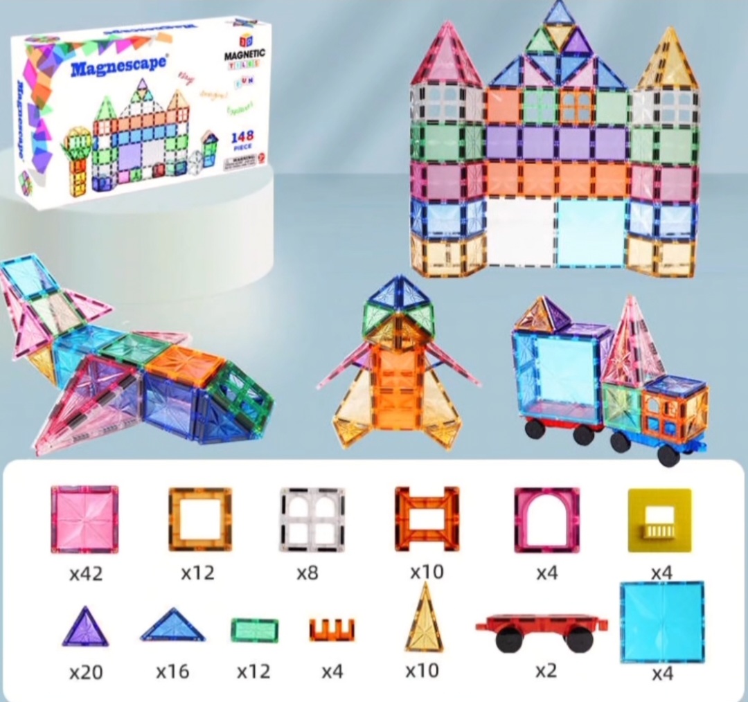 Set sadrži 66 raznobojnih elemenata različitih oblika: kvadrate, trouglove, prozore, vrata, pravougaonike, točkove i platformu za vozila. Zahvaljujući jakim magnetima, delovi se lako spajaju iz svih pravaca, što omogućava stabilne i maštovite konstrukcije.