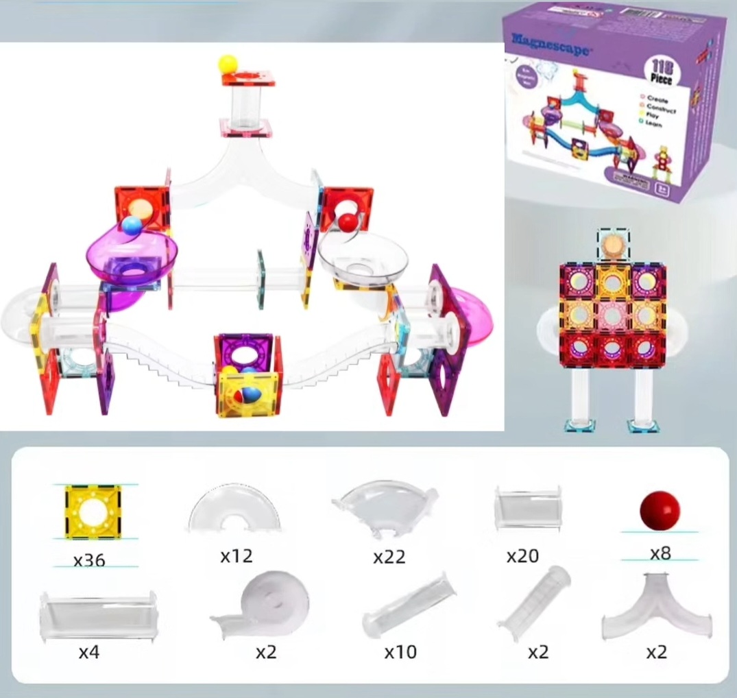 Zabavan i edukativan Magnescape Ball Run set sadrži 85 magnetnih delova i 75 cevastih elemenata sa kuglicama. Deca mogu da grade kule, lavirinte i staze niz koje kuglice jure, razvijajući maštu i logičko razmišljanje.