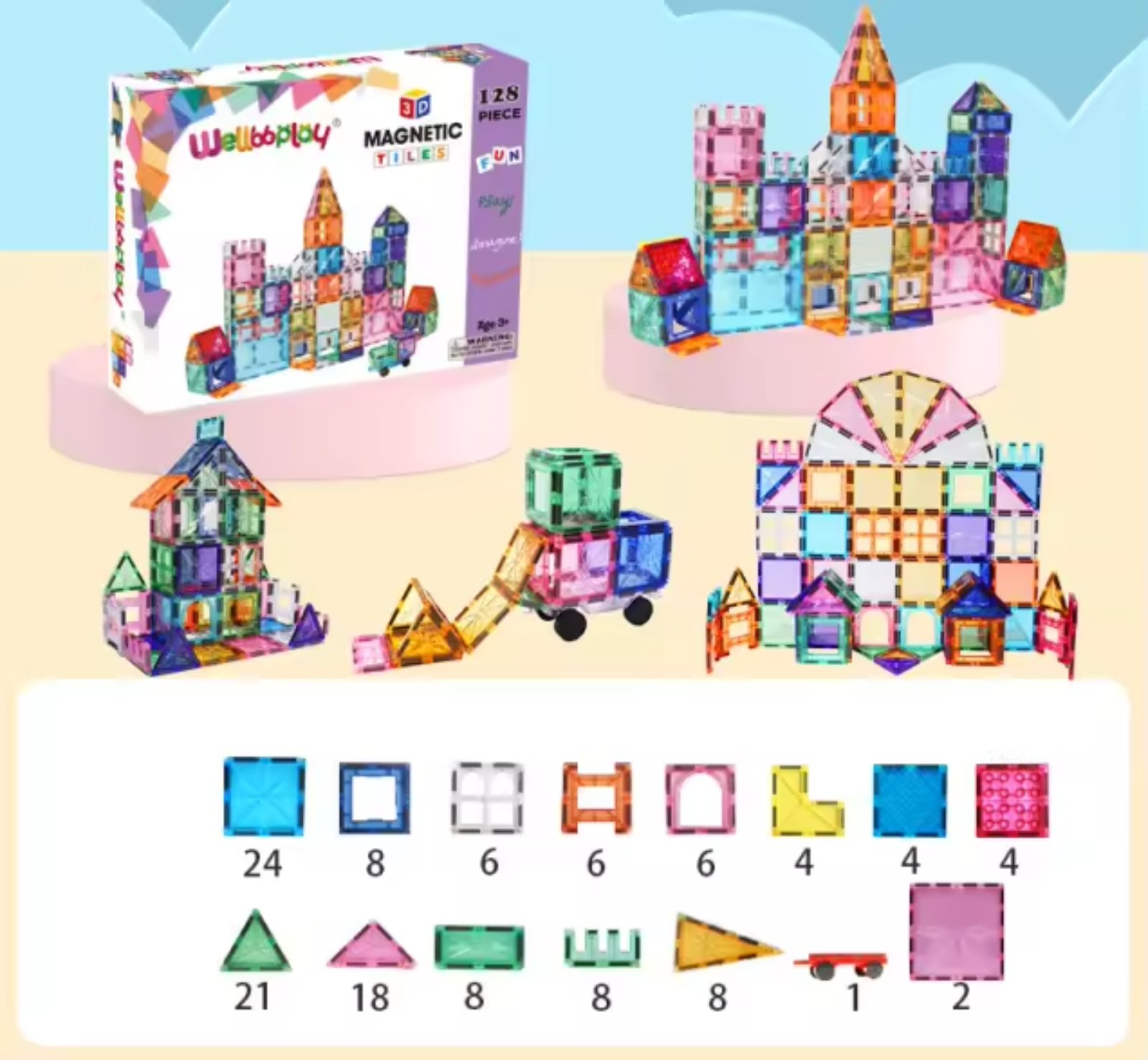 Set od 128 raznobojnih magnetnih pločica omogućava djeci da grade dvorce, kuće, vozila i razne 3D konstrukcije. Snažni magneti osiguravaju lako spajanje i stabilnost, dok različiti oblici podstiču maštu i kreativnost.